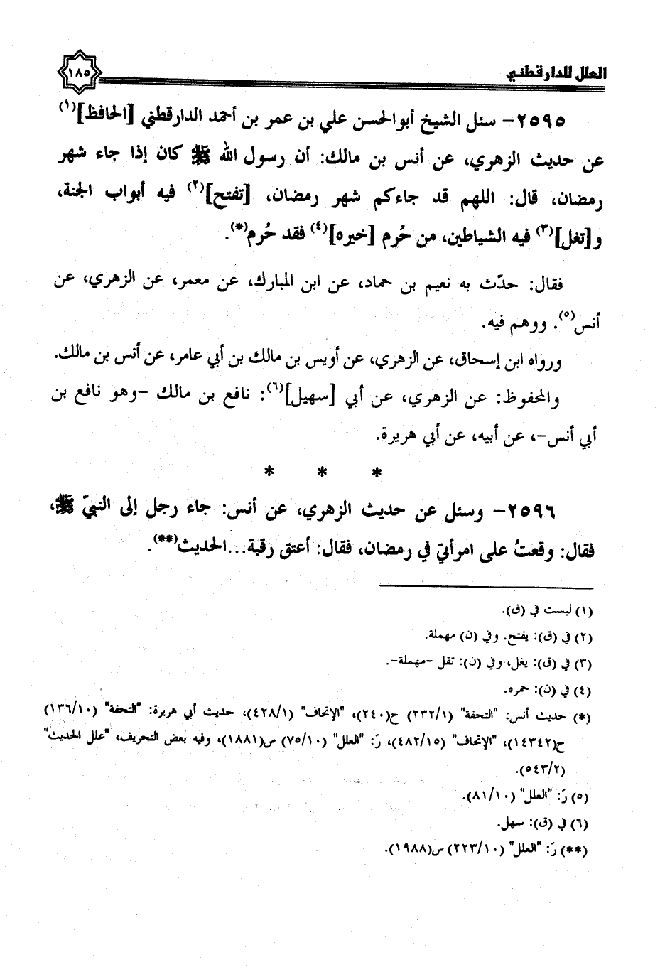 2595- سُئِلَ الشَّيْخُ أَبُو الْحَسَنِ عَلِيُّ بْنُ عُمَرَ بْنِ أحمد الدارقطني الحافظ عن حديث الزهري، عن أنس بن مالك؛ أن رسول الله صلى الله عليه وسلم كان إذا جاء شهر رمضان، قال: اللهم قد جاءكم شهر رمضان، تفتح فيه أبواب الجنة، وتغل فيه الشياطين، من حرم خيره فقد حرم.
