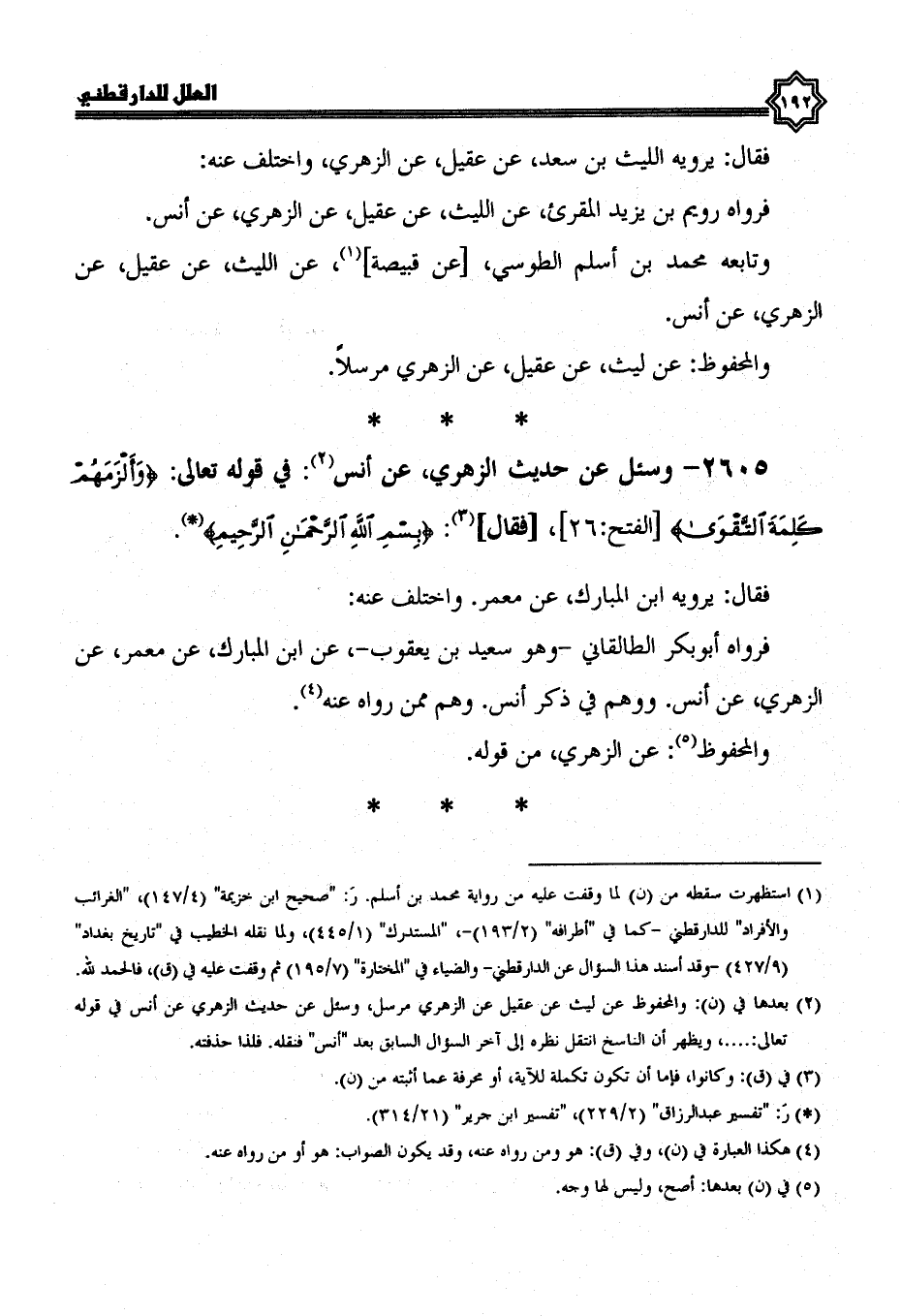 2605- وسئل عن حديث الزهري، عن أنس في قوله تعالى: {وألزمهم كلمة التقوى} ، فقال: {بسم الله الرحمن الرحيم} .