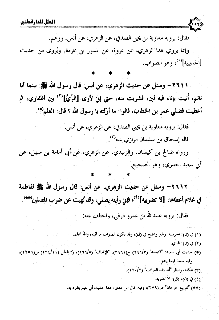 2611- وسئل عن حديث الزهري، عن أنس، قال رسول الله صلى الله عليه وسلم: بينما أنا نائم، أتيت بإناء فيه لبن، فَشَرِبْتُ مِنْهُ، حَتَّى إِنِّي لَأَرَى الرِّيَّ بَيْنَ أظفاري، ثم أعطيت فضلي عمر بن الخطاب، قالوا: ما أولته يا رسول الله؟ قال: العلم.