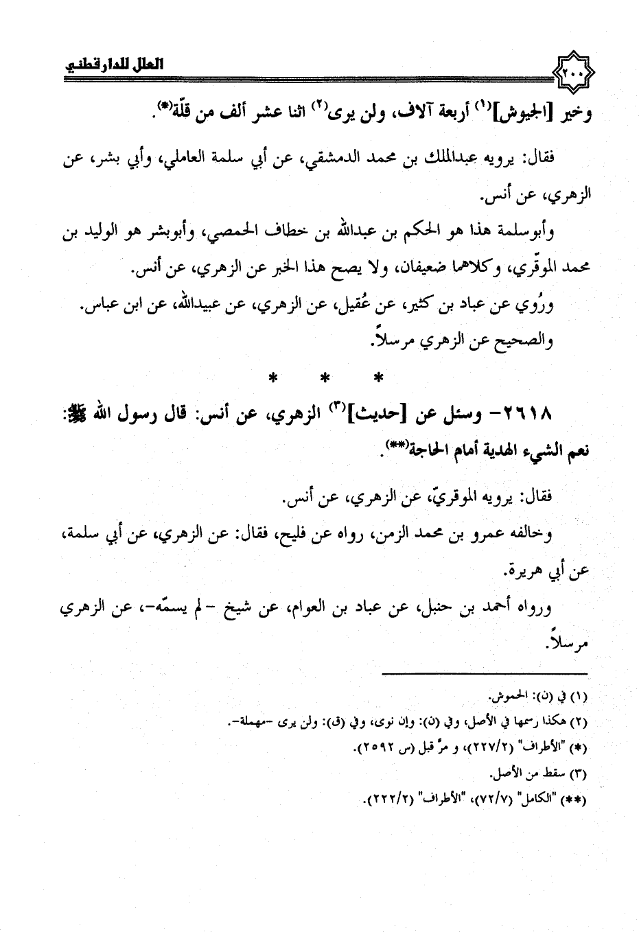 2617- وسئل عن حديث الزهري، عن أنس بْنِ مَالِكٍ: قَالَ رَسُولُ اللَّهِ صَلَّى اللَّهُ عليه وسلم: يا أكثم بن الجون، اغز مع غير قومك يحسن خلقك، وتكرم على رفقائك، يا أكثم، خير الرفقاء أربعة، وخير الطلائع أربعون، وخير السرايا أربع مئة، وخير الجيوش أربعة آلاف، ولن يغلب (1) اثنا عشر ألف من قلة.
