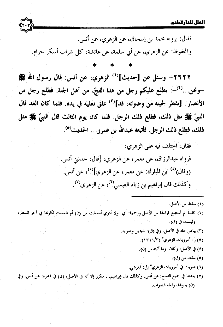 2622- وسئل عن حديث الزهري، عن أنس، قال رسول الله صلى الله عليه وسلم، ونحن ... : يطلع عليكم رجل من هذا الفج، من أهل الجنة، فطلع رجل من الأنصار، تقطر لحيته من وضوئه، قد علق نعليه في يده، فلما كان الغد قال النبي صلى الله عليه وسلم مثل ذلك، فطلع ذلك الرجل، فلما كان يوم الثالث قال النبي صلى الله عليه وسلم مثل ذلك، فطلع ذلك الرجل، فأتبعه عبد الله بن عمرو ... الحديث.