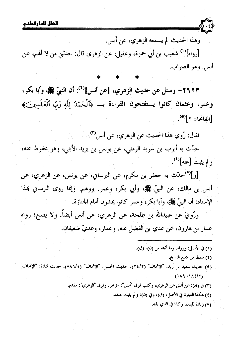 2623- وسئل عن حديث الزهري، عَنْ أَنَسٍ أَنَّ النَّبِيَّ صَلَّى اللَّهُ عَلَيْهِ وسلم، وأبا بكر، وعمر، وعثمان، كانوا يستفتحون القراءة بـ {الحمد لله رب العالمين} .