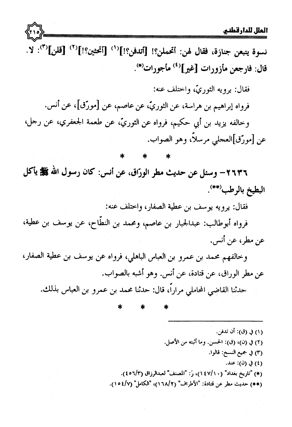 2636- وسئل عن حديث مطر الوراق، عن أنس: كَانَ رَسُولُ اللَّهِ صَلَّى اللَّهُ عَلَيْهِ وَسَلَّمَ يأكل البطيخ بالرطب.