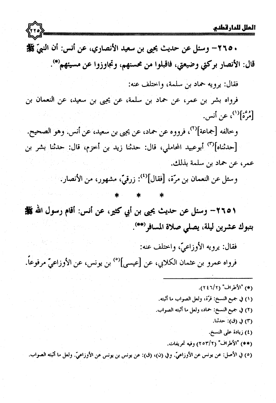 2651- وَسُئِلَ عَنْ حَدِيثِ يَحْيَى بْنِ أَبِي كَثِيرٍ، عن أنس، أقام رسول الله صلى الله عليه وسلم بتبوك عشرين ليلة يصلي صلاة المسافر.