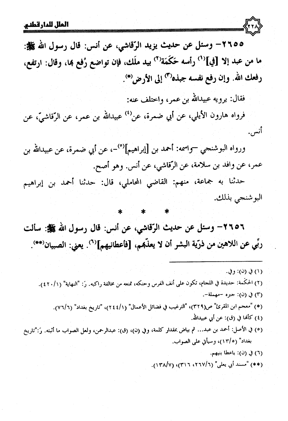 2655- وسئل عن حديث يزيد الرقاشي، عن أنس، قال رسول الله صلى الله عليه وسلم: ما من عبد إلا في رأسه حكمة بيد ملك، فإن تواضع رفع بها، وقال: ارتفع رفعك الله، وإن رفع نفسه جبذه إلى الأرض.