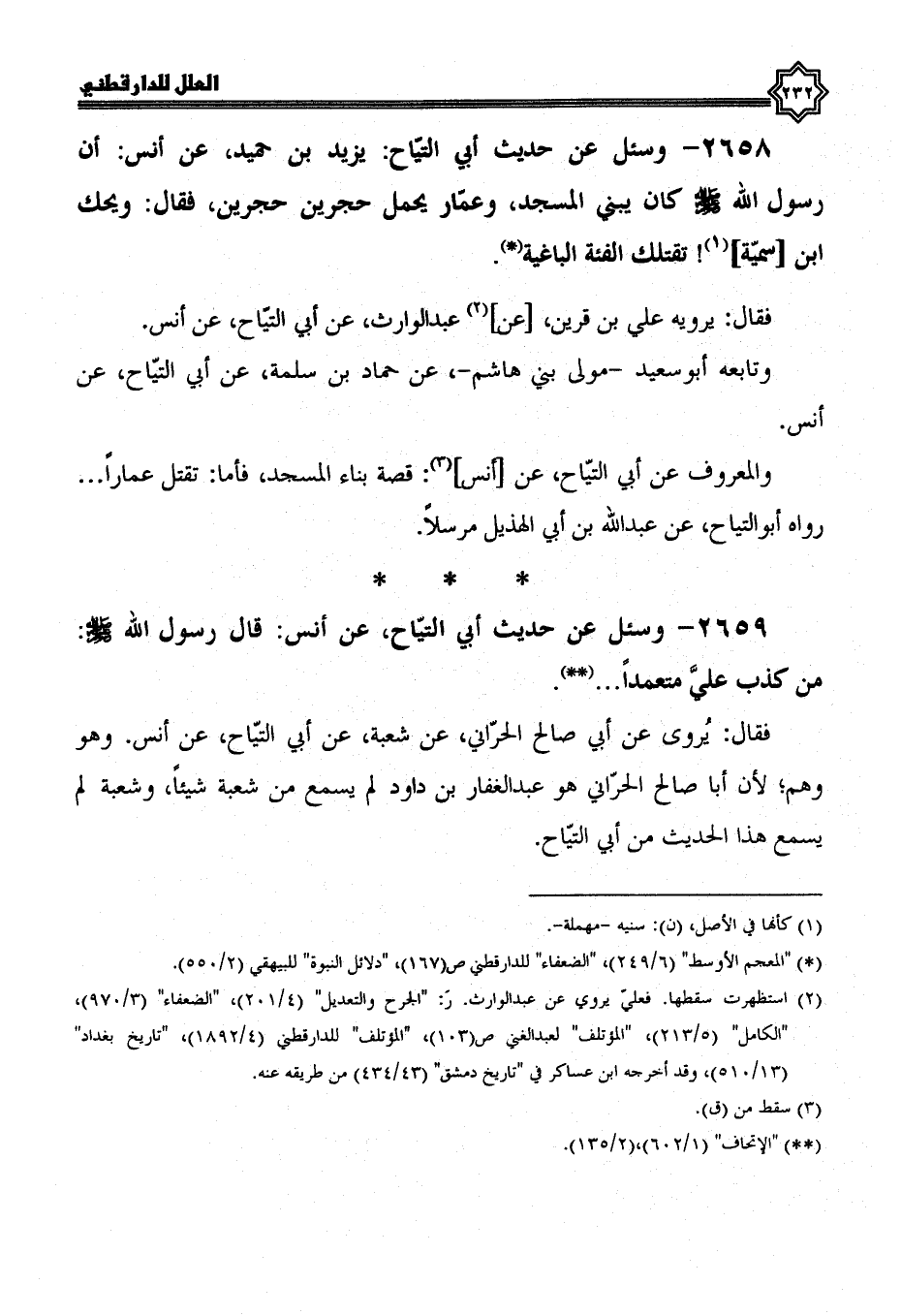 2658- وسئل عن حديث أبي التياح يزيد بن حميد، عن أنس، أن رسول الله صلى الله عليه وسلم كان يبني المسجد وعمار يحمل حجرين حجرين، فقال: ويحك ابن سمية تقتلك الفئة الباغية.