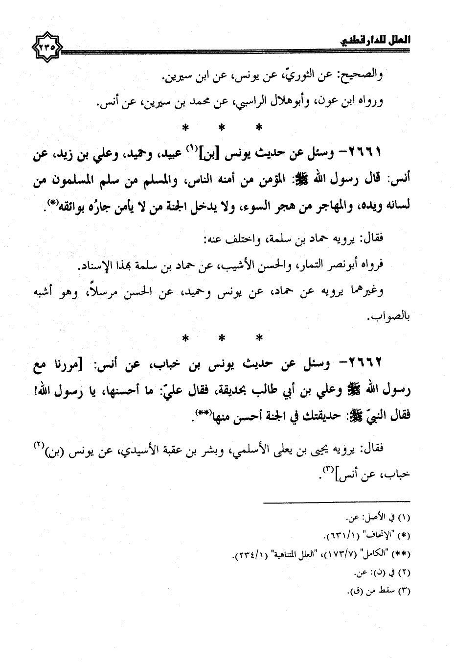 2662- وسئل عن حديث يونس بن خباب، عن أنس مررنا مَعَ رَسُولِ اللَّهِ صَلَّى اللَّهُ عَلَيْهِ وَسَلَّمَ، وعلي بن أبي طالب بحديقة، فقال علي: ما أحسنها يا رسول الله فقال النبي صلى الله عليه وسلم: حديقتك في الجنة أحسن منها.