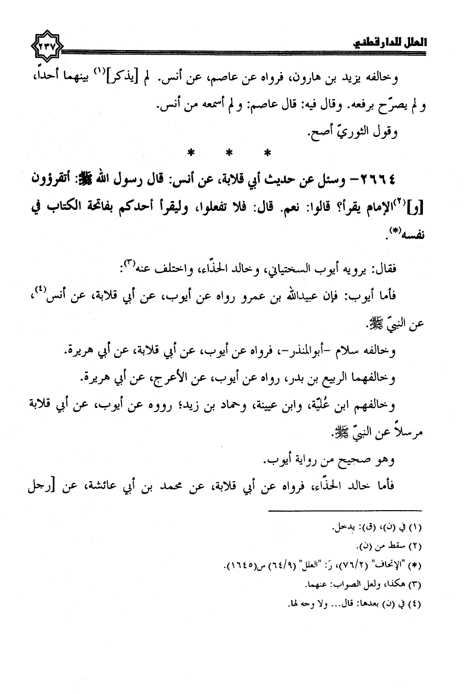 2664- وسئل عن حديث أبي قلابة، عن أنس، قال رسول الله صلى الله عليه وسلم: أتقرؤون والإمام يقرأ؟ قالوا: نعم قال: فلا تفعلوا، وليقرأ أحدكم بفاتحة الكتاب في نفسه.