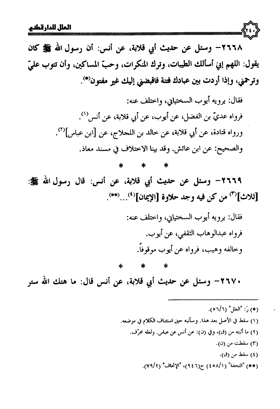 2669- وسئل عن حديث أبي قلابة، عن أنس، قال رسول الله صلى الله عليه وسلم: ثلاث من كن فيه وجد حلاوة الإيمان ...