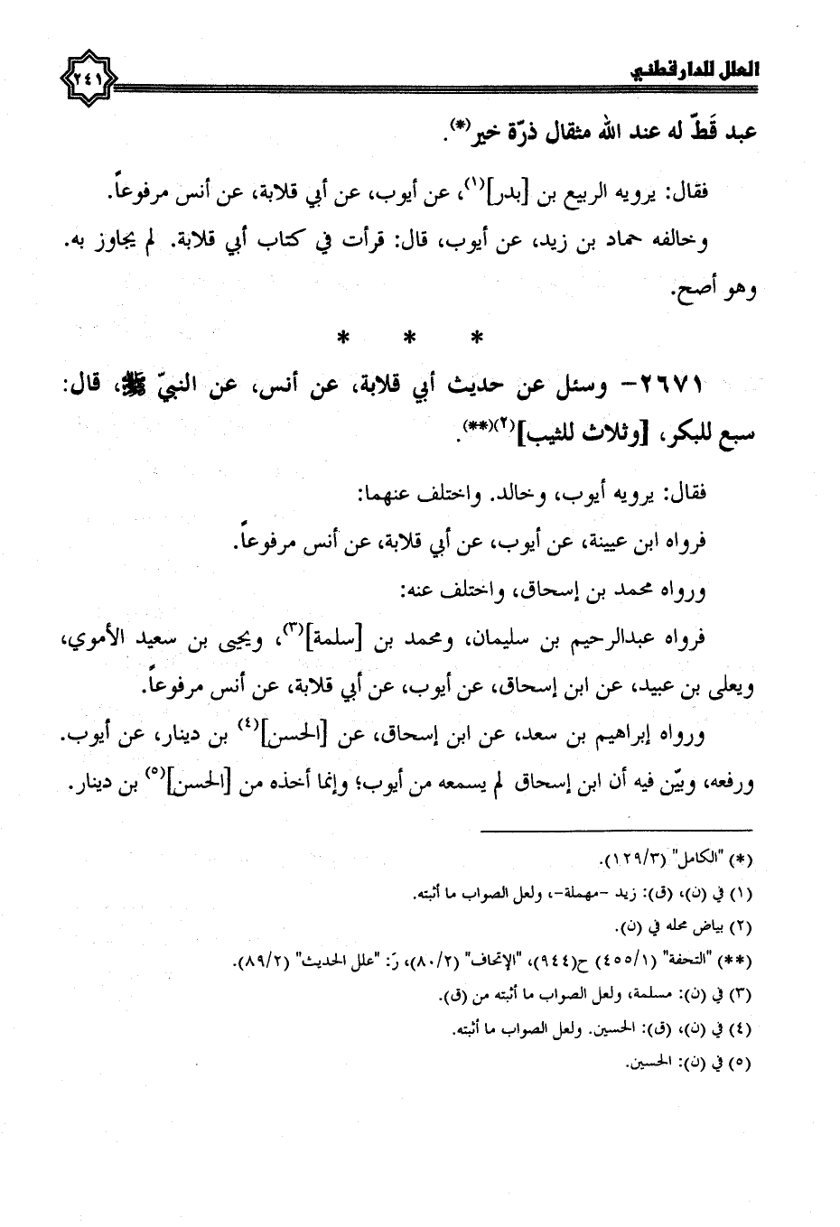 2671- وسئل عن حديث أبي قلابة، عَنْ أَنَسٍ، عَنِ النَّبِيِّ صَلَّى اللَّهُ عَلَيْهِ وسلم، قال: سبع للبكر، وثلاث للثيب.