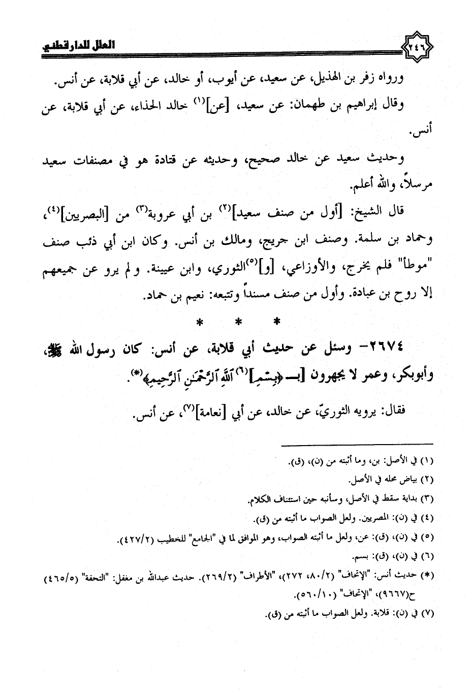 2674- وسئل عن حديث أبي قلابة، عن أنس كَانَ رَسُولُ اللَّهِ صَلَّى اللَّهُ عَلَيْهِ وَسَلَّمَ: وأبو بكر، وعمر لا يجهرون بـ {بسم الله الرحمن الرحيم} .