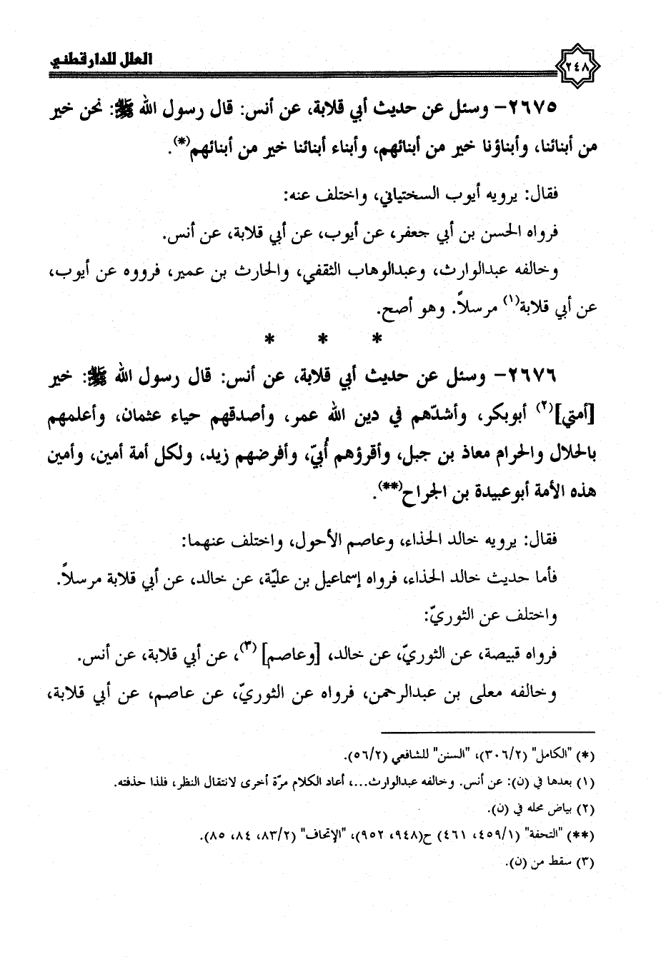 2676- وسئل عن حديث أبي قلابة، عن أنس، قال رسول الله صلى الله عليه وسلم: خير أمتي أبو بكر، وأشدهم في دين الله عمر، وأصدقهم حياء عثمان، وأعلمهم بالحلال والحرام معاذ بن جبل، وأقرؤهم أبي، وأفرضهم زيد، ولكل أمة أمين، وأمين هذه الأمة أبو عبيدة بن الجراح.