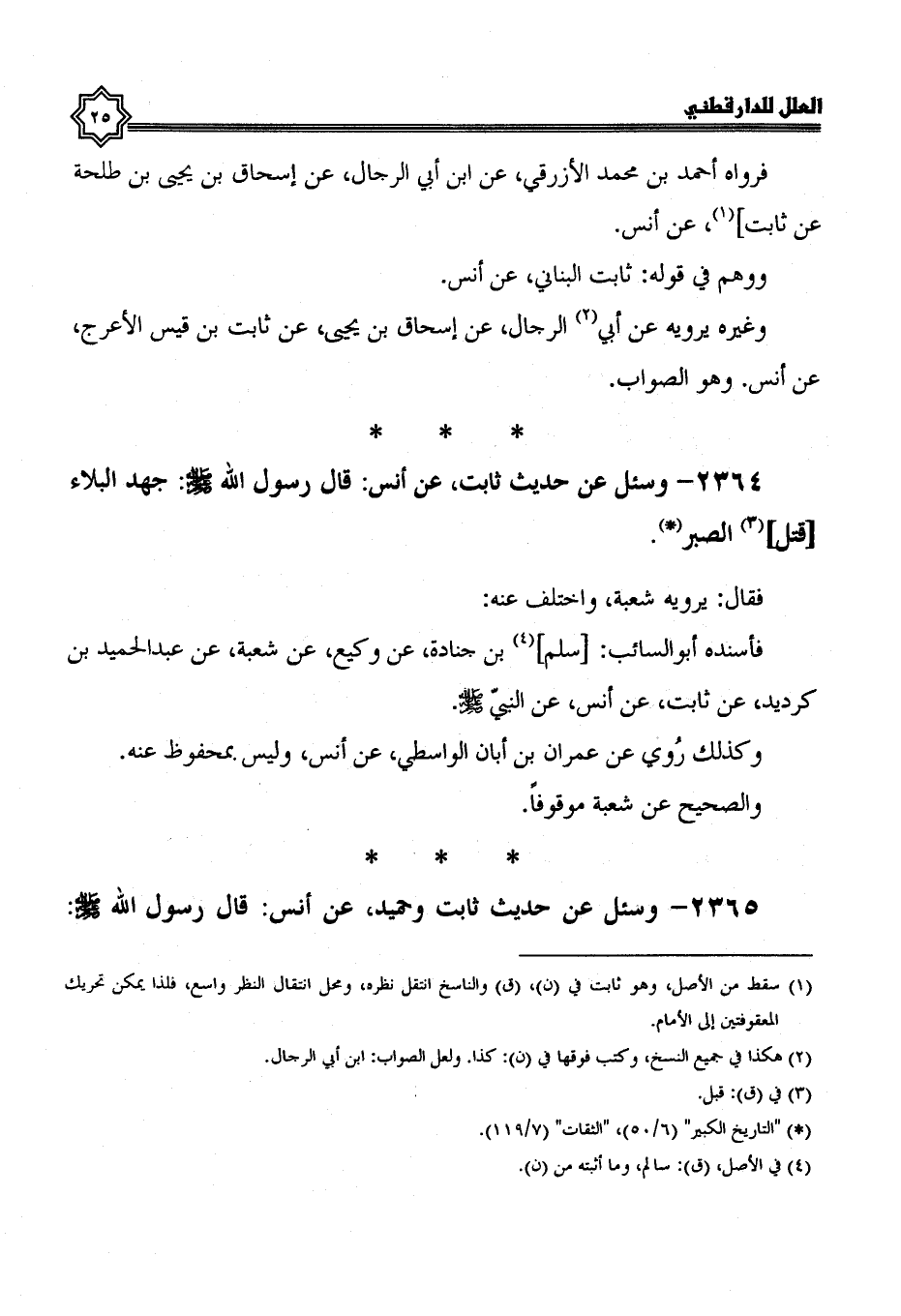 2364- وسئل عن حديث ثابت، عن أنس، قال رسول الله صلى الله عليه وسلم: جهد البلاء قتل الصبر.