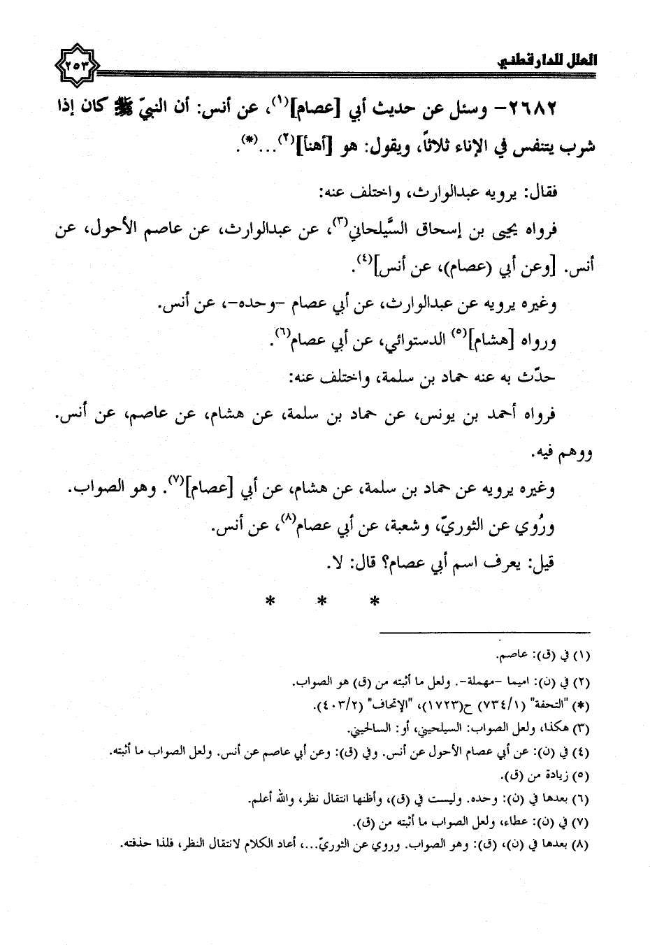 2682- وسئل عن حديث أبي عصام، عَنْ أَنَسٍ أَنَّ النَّبِيَّ صَلَّى اللَّهُ عَلَيْهِ وسلم كان إذا شرب يتنفس في الإناء ثلاثا، ويقول: هو أهنأ ...
