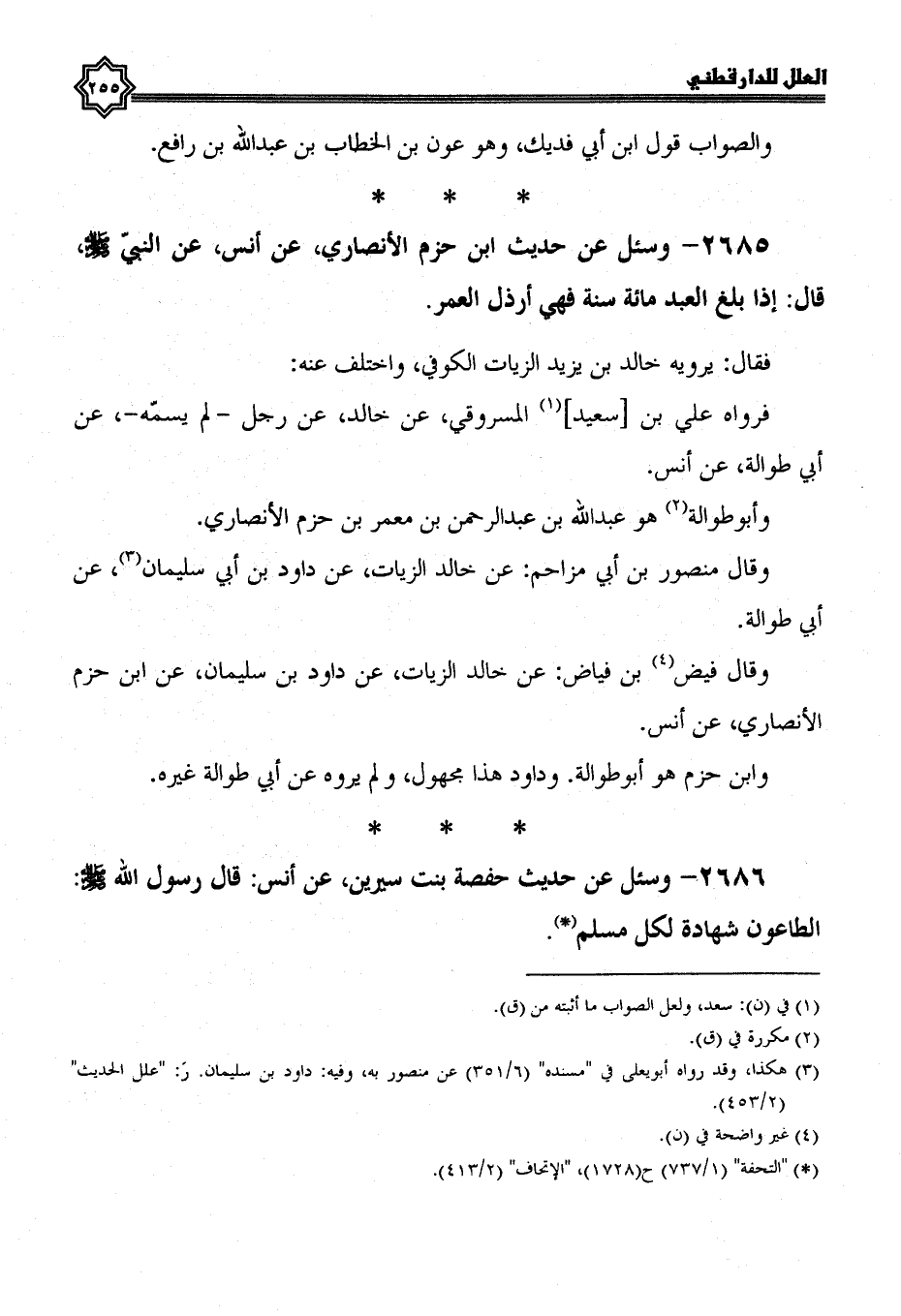 2685- وسئل عن حديث ابن حزم الأنصاري، عَنْ أَنَسٍ، عَنِ النَّبِيِّ صَلَّى اللَّهُ عَلَيْهِ وسلم، قال: إذا بلغ العبد مئة سنة فهي أرذل العمر.
