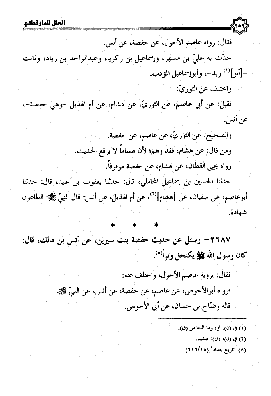 2687- وسئل عن حديث حفصة بنت سيرين، عن أنس بن مالك، قَالَ: كَانَ رَسُولُ اللَّهِ صَلَّى اللَّهُ عَلَيْهِ وسلم يكتحل وترا.