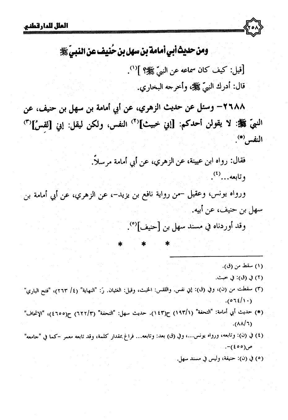 2688- وسئل عن حديث الزُّهْرِيِّ، عَنْ أَبِي أُمَامَةَ بْنِ سَهْلِ بْنِ حُنَيْفٍ، عَنِ النَّبِيِّ صَلَّى اللَّهُ عَلَيْهِ وَسَلَّمَ: لَا يقولن أحدكم: إني خبيث النفس، ولكن ليقل: إني لقس النفس.