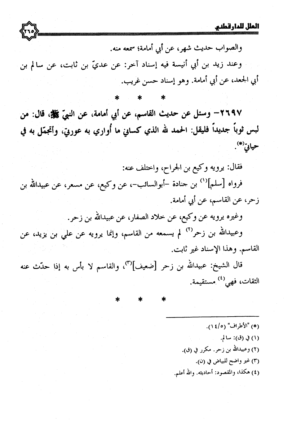 2697- وسئل عن حديث القاسم، عَنْ أَبِي أُمَامَةَ، عَنِ النَّبِيِّ صَلَّى اللَّهُ عليه وسلم قال: من ليس ثوبا جديدا فليقل: الْحَمْدُ لِلَّهِ الَّذِي كَسَانِي مَا أُوَارِي بِهِ عورتي، وأتجمل به في حياتي.