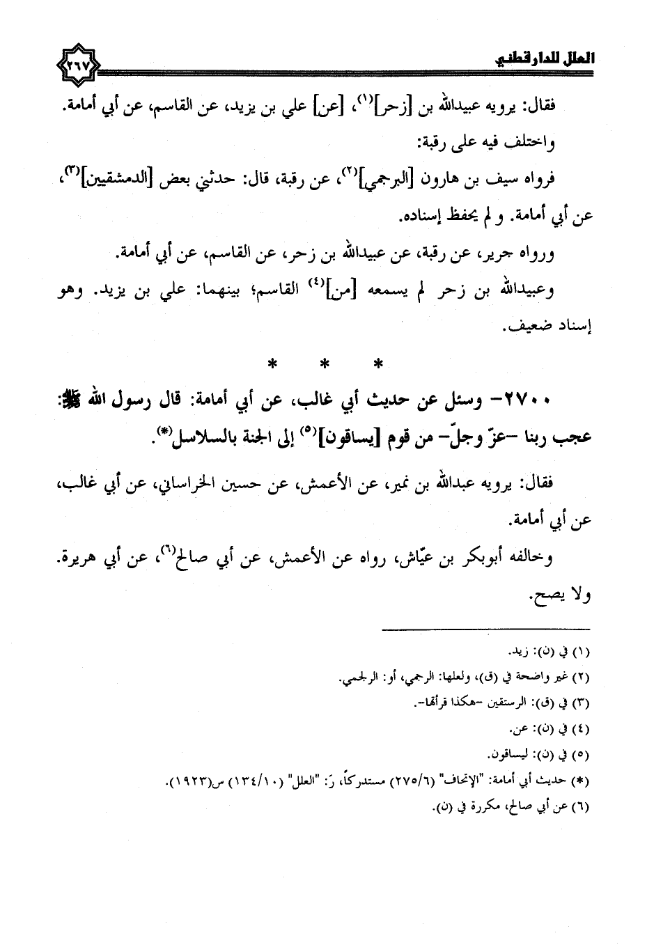 2700- وسئل عن حديث أبي غالب، عن أبي أمامة: قال رسول الله صلى الله عليه وسلم: عجب ربنا، عز وجل، من قوم يساقون إلى الجنة بالسلاسل.