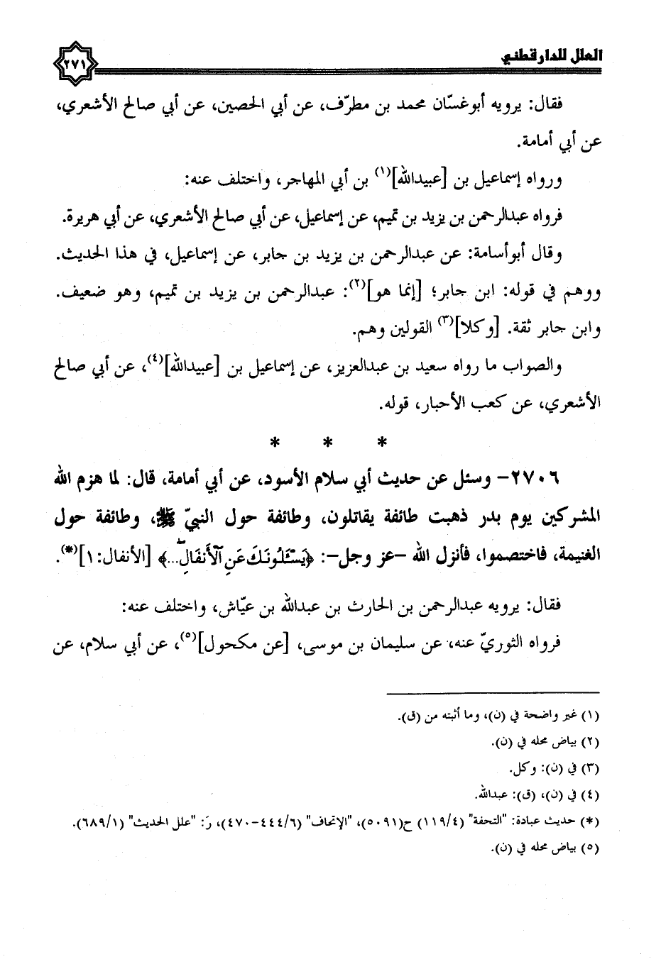 2706- وسئل عن حديث أبي سلام الأسود، عن أبي أمامة، قال: لما هزم الله المشركين يوم بدر ذهبت طائفة يقاتلون، وطائفة حول النبي صلى الله عليه وسلم، وطائفة حول الغنيمة، فاختصموا، فأنزل الله، عز وجل: {يسئلونك عن الأنفال} ...