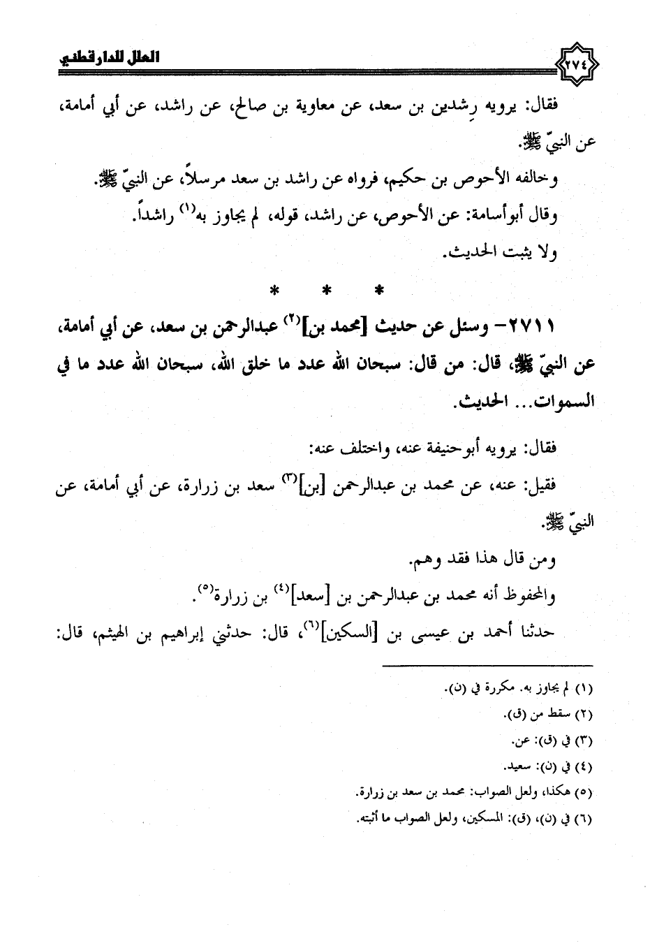 2711- وَسُئِلَ عَنْ حَدِيثِ مُحَمَّدِ بْنِ عَبْدِ الرَّحْمَنِ بن سعد، عَنْ أَبِي أُمَامَةَ عَنِ النَّبِيِّ صَلَّى اللَّهُ عليه وسلم، قال: من قال: سبحان الله عدد ما خلق الله، سبحان الله عدد ما في السموات ... الحديث.