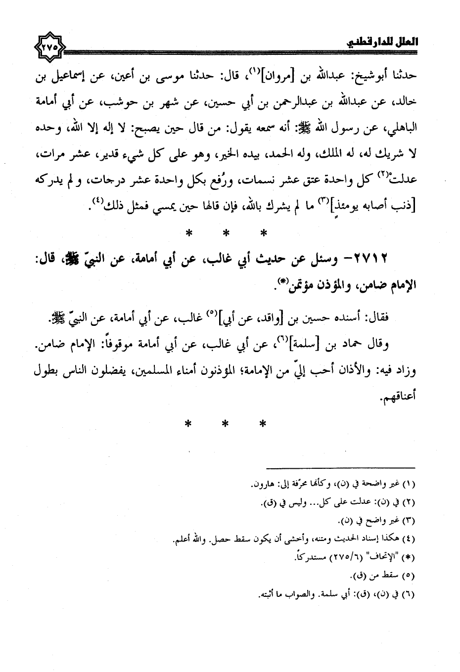 2712- وسئل عن حديث أبي غالب، عَنْ أَبِي أُمَامَةَ، عَنِ النَّبِيِّ صَلَّى اللَّهُ عليه وسلم، قال: الإمام ضامن، والمؤذن مؤتمن.