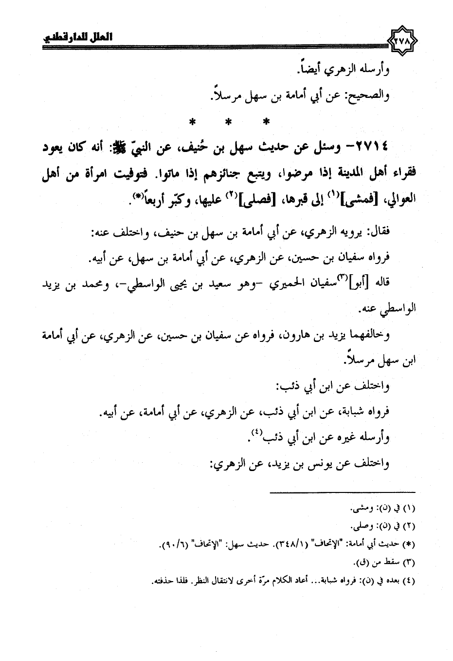 2714- وسئل عن حديث سهل بن حنيف، عن النبي صلى الله عليه وسلم؛ إنه كان يعود فقراء أهل المدينة إذا مرضوا، ويتبع جنائزهم إذا ماتوا، فتوفيت امرأة من أهل العوالي، فمشى إلى قبرها، فصلى عليها، وكبر أربعا.