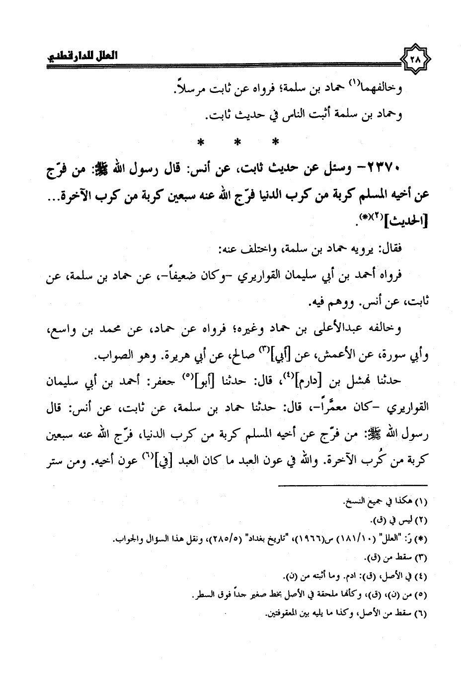 2370- وسئل عن حديث ثابت، عن أنس، قال رسول الله صلى الله عليه وسلم: مَنْ فَرَّجَ عَنْ أَخِيهِ الْمُسْلِمِ كُرْبَةً مِنْ كرب الدنيا فرج الله عنه سبعين كربة من كرب الآخرة ... الْحَدِيثَ.
