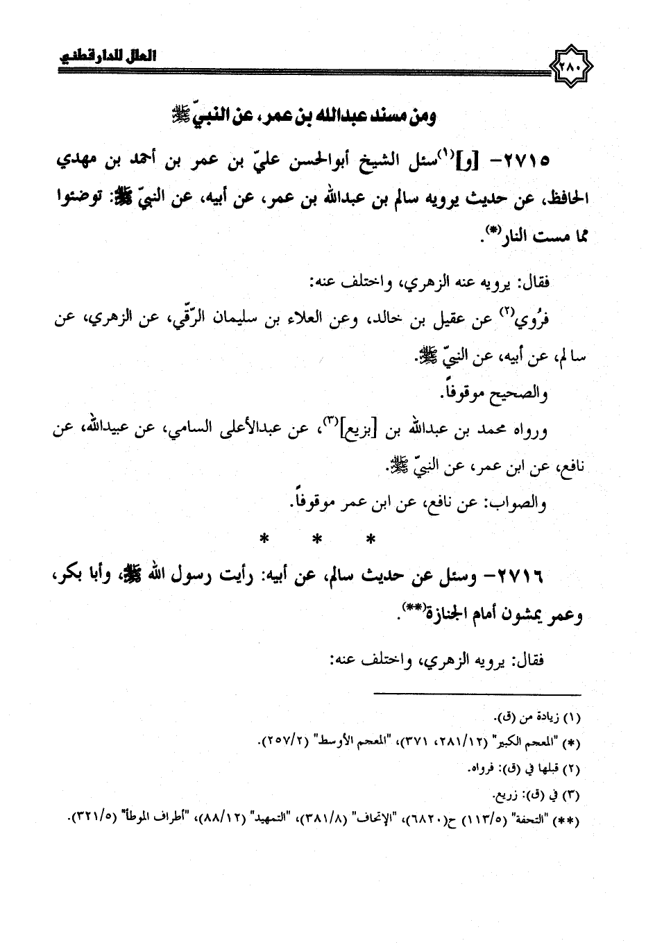 2715- وَسُئِلَ الشَّيْخُ أَبُو الْحَسَنِ عَلِيُّ بْنُ عُمَرَ بْنِ أَحْمَدَ بْنِ مَهْدِيٍّ الْحَافِظُ، عَنْ حَدِيثِ يَرْوِيهِ سَالِمُ بْنُ عَبْدِ اللَّهِ بْنِ عُمَرَ، عَنْ أَبِيهِ، عَنِ النَّبِيِّ صَلَّى اللَّهُ عَلَيْهِ وسلم: توضؤوا مما مست النار.