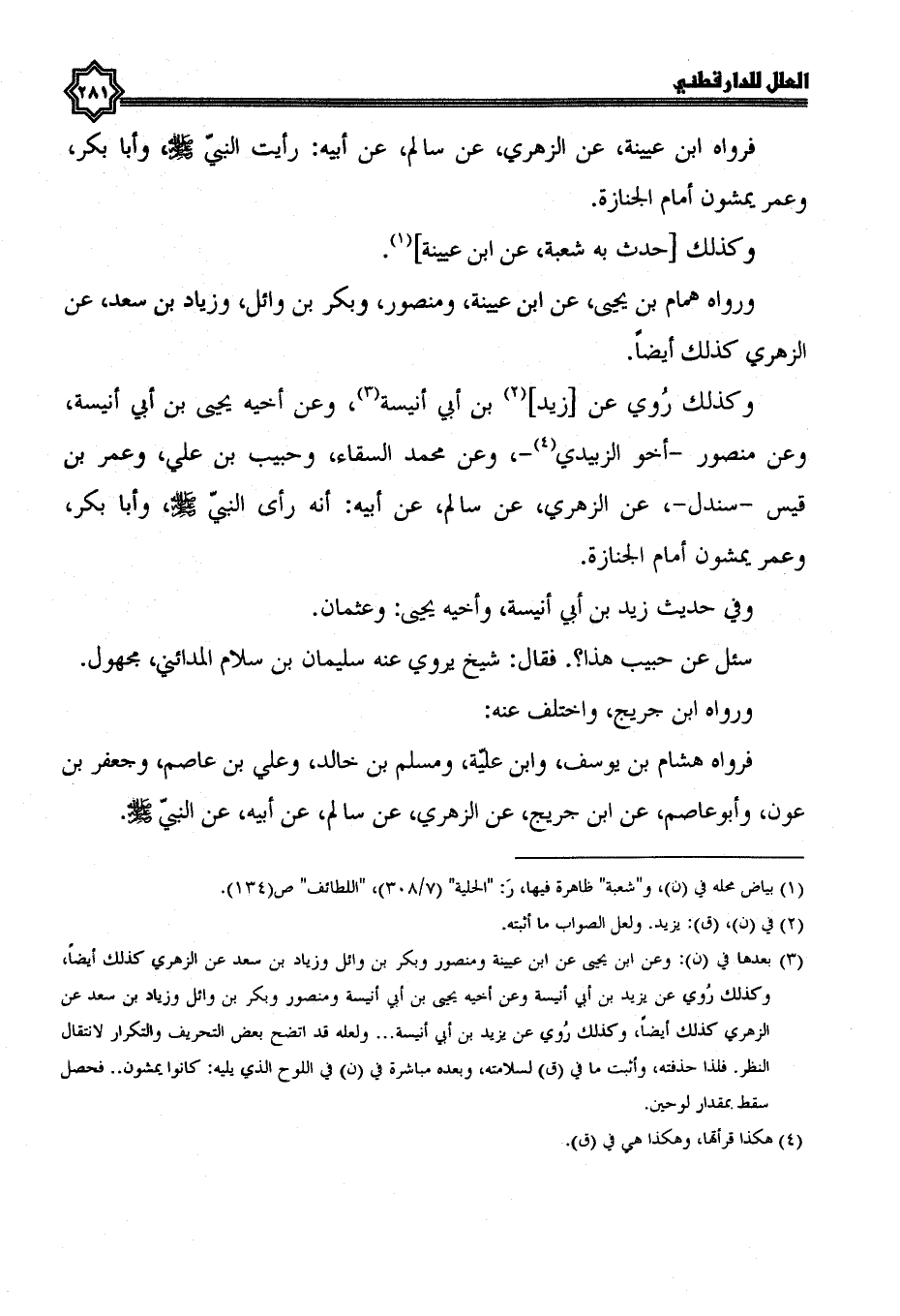وكذلك روي عن زيد بن أبي أنيسة، وعن أخيه يحيى بن أبي أنيسة، وعن منصور، أخو الزبيدي، وعن محمد السقاء، وحبيب بن علي، وعمر بن قيس، سندل، عن الزهري، عن سالم، عن أبيه؛ أَنَّهُ رَأَى النَّبِيَّ صَلَّى اللَّهُ عَلَيْهِ وَسَلَّمَ، وأبا بكر، وعمر يمشون أمام الجنازة.
