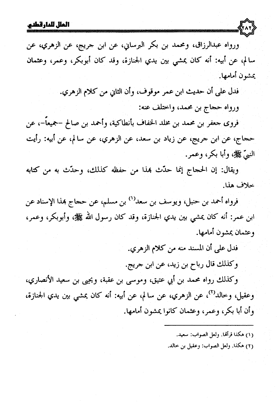 وكذلك رواه مُحَمَّدُ بْنُ أَبِي عَتِيقٍ، وَمُوسَى بْنُ عُقْبَةَ، ويحيى بن سعيد الأنصاري، وعقيل بن خالد (1) ، عن الزهري، عن سالم، عن أبيه؛ أنه كان يمشي بين يدي الجنازة، وأن أبا بكر، وعمر، وعثمان، كانوا يمشون أمامها.