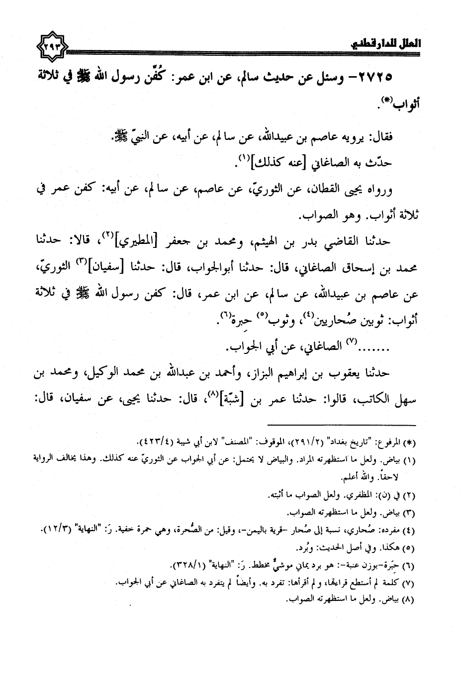 حدثنا القاضي بدر بن الهيثم، ومحمد بن جعفر المطيري، قالا: حدثنا محمد بن إسحاق الصاغاني، قال: حدثنا أبو الجواب، قال: حدثنا سُفْيَانُ الثَّوْرِيُّ، عَنْ عَاصِمِ بْنِ عُبَيْدِ اللَّهِ، عن سالم، عن ابن عمر، قال: كُفِّنَ رَسُولُ اللَّهِ صَلَّى اللَّهُ عَلَيْهِ وَسَلَّمَ في ثلاثة أثواب: ثوبين صحاريين، وثوب حبرة ...