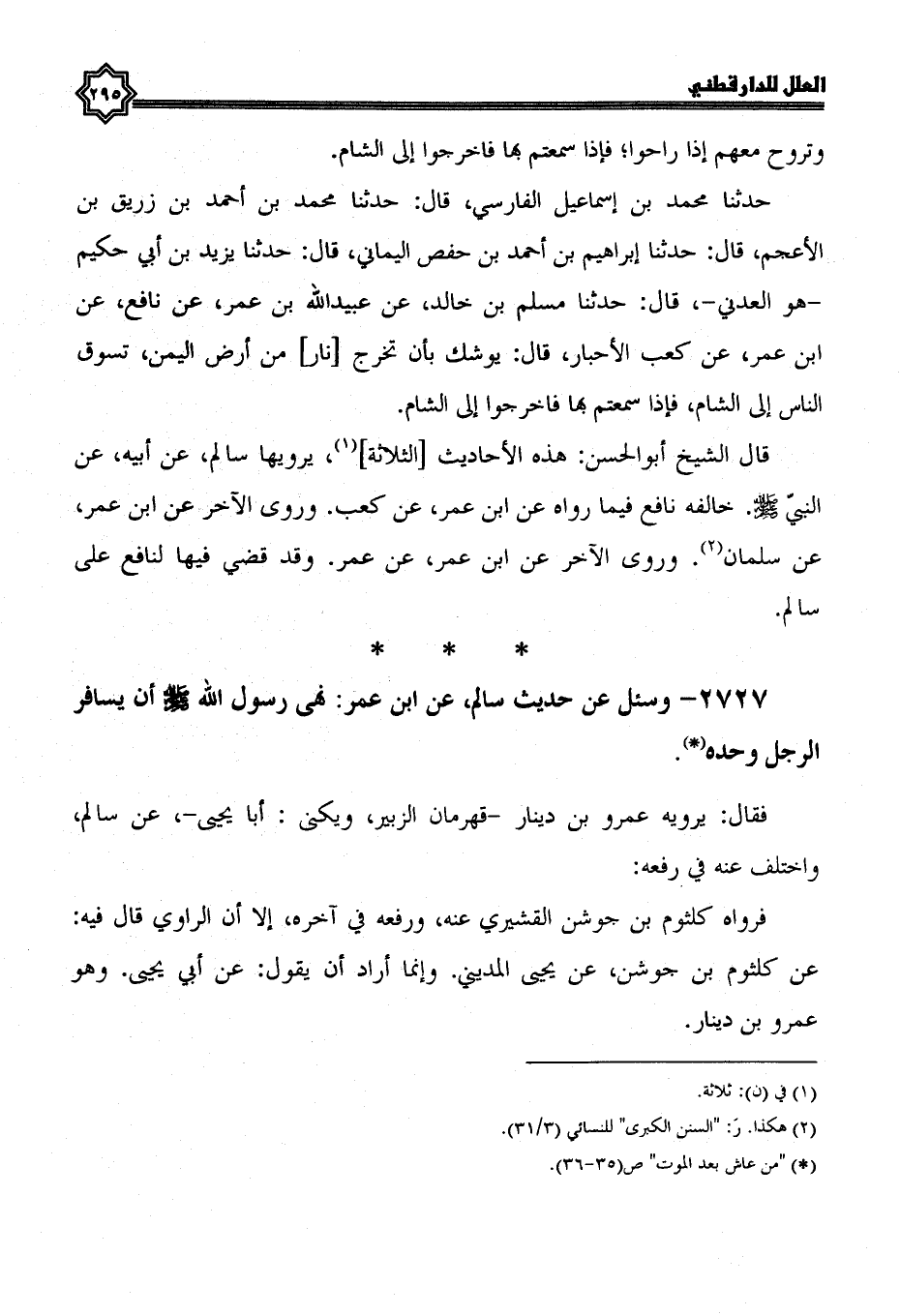 2727- وَسُئِلَ عَنْ حَدِيثِ سَالِمٍ، عَنِ ابْنِ عُمَرَ: نَهَى رَسُولُ اللَّهِ صَلَّى اللَّهُ عَلَيْهِ وَسَلَّمَ أن يسافر الرجل وحده.