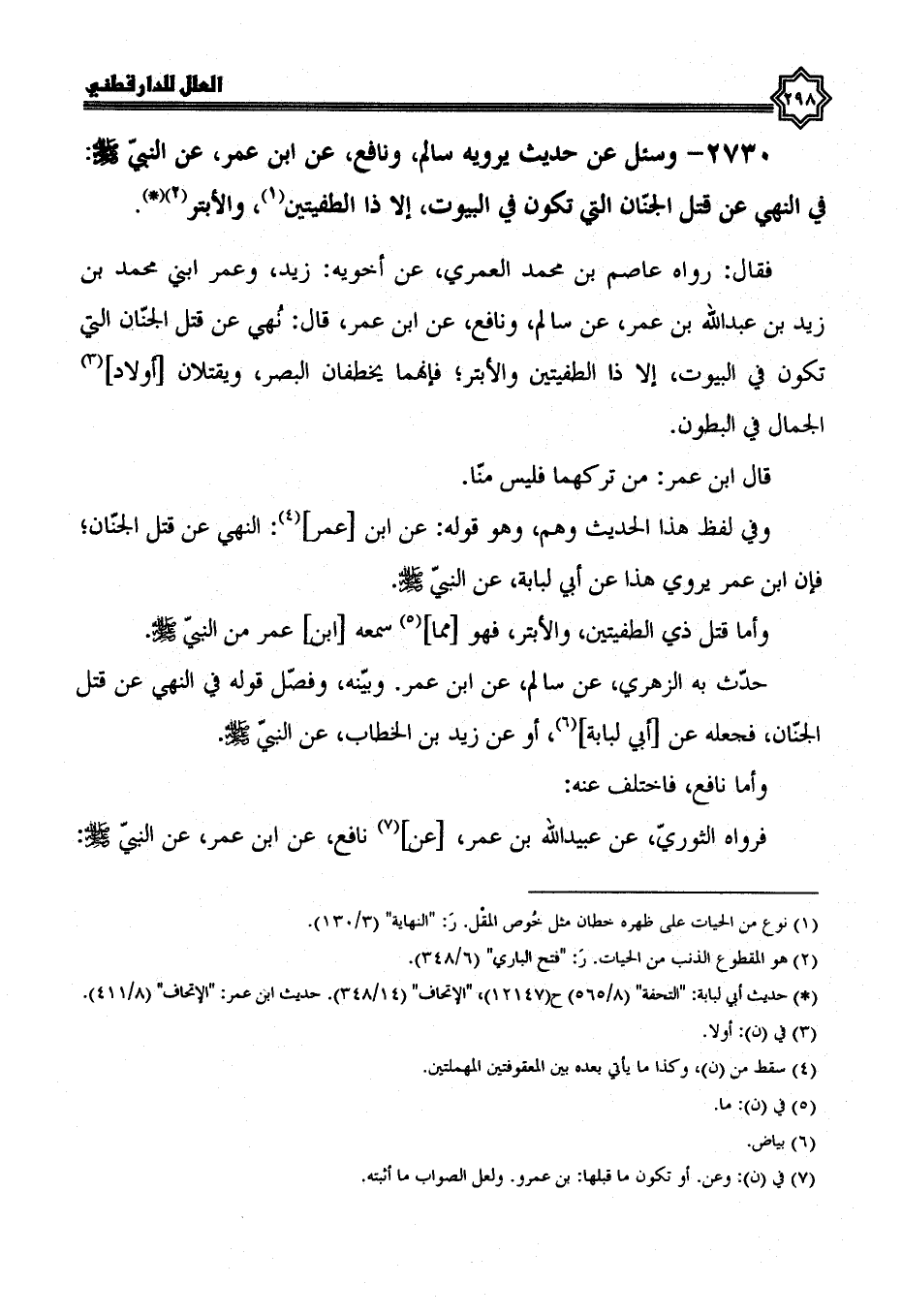 فقال: رواه عاصم بن محمد العمري، عن أخويه: زيد وعمر ابني محمد بن زيد بن عبد الله بن عمر، عن سالم، ونافع، عن ابن عمر، قال: نهي عن قتل الجنان التي تكون في البيوت، إلا ذا الطفيتين والأبتر؛ فإنهما يخطفان البصر، ويقتلان أولاد الجمال في البطون.