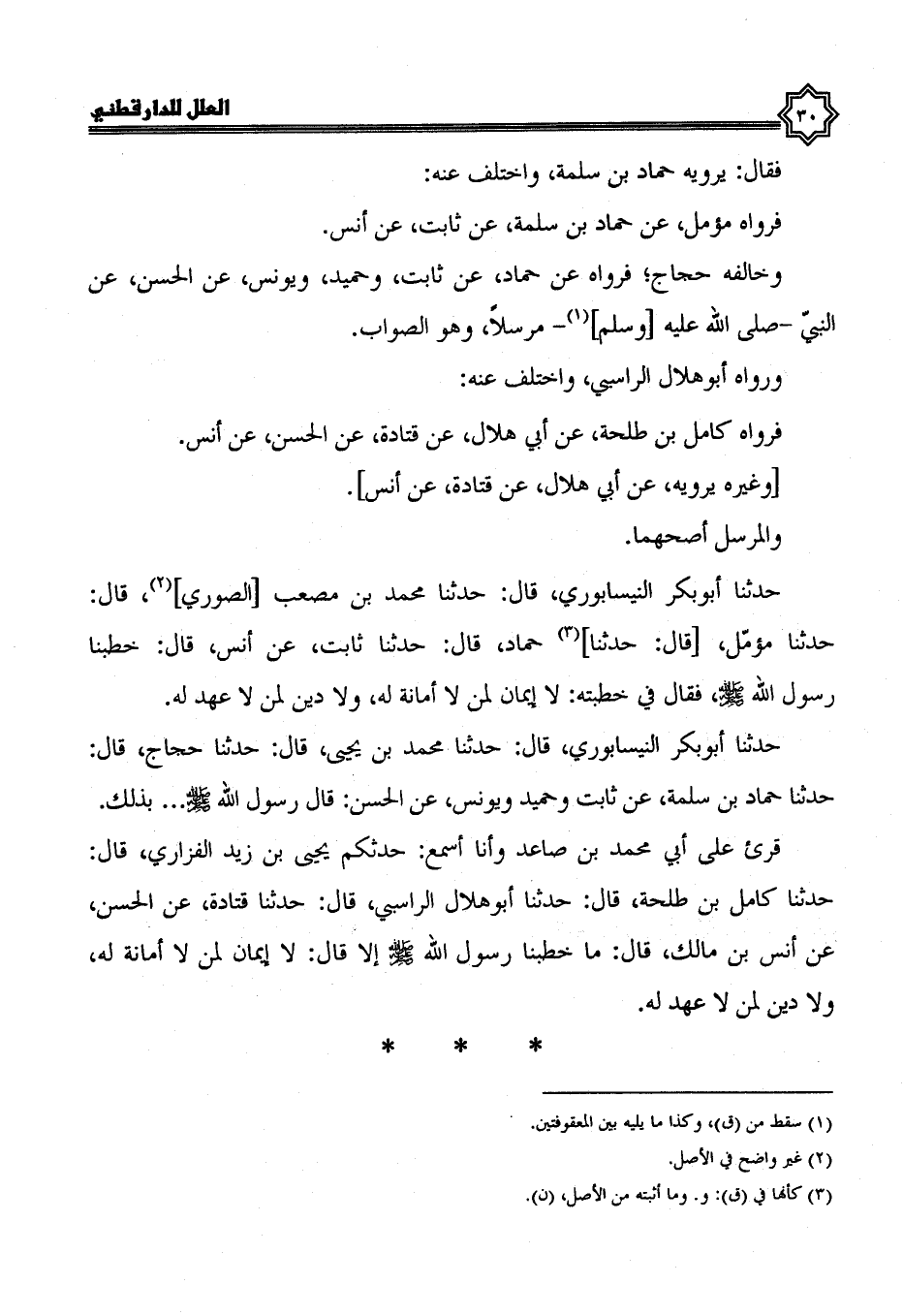 قرئ عَلَى أَبِي مُحَمَّدِ بْنِ صَاعِدٍ وَأَنَا أَسْمَعُ: حدثكم يحيى بن زيد الفزاري، قال: حدثنا كامل بن طلحة، قال: حدثنا أبو هلال الراسبي، قال: حدثنا قتادة، عن الحسن، عن أنس بن مالك، قال: ما خَطَبَنَا رَسُولُ اللَّهِ صَلَّى اللَّهُ عَلَيْهِ وَسَلَّمَ إلا قال: لا إيمان لمن لا أمانة له، ولا دين لمن لا عهد له.