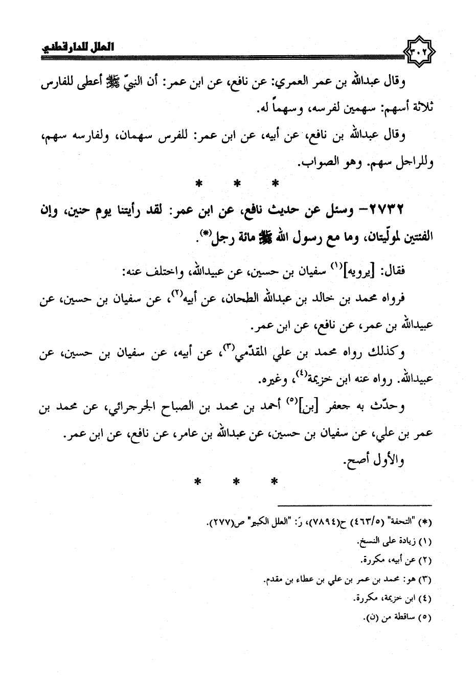 2732- وَسُئِلَ عَنْ حَدِيثِ نَافِعٍ، عَنِ ابْنِ عُمَرَ؛ لقد رأيتنا، يوم حنين، وإن الفئتين لموليتان، وما مَعَ رَسُولِ اللَّهِ صَلَّى اللَّهُ عَلَيْهِ وَسَلَّمَ مئة رجل.