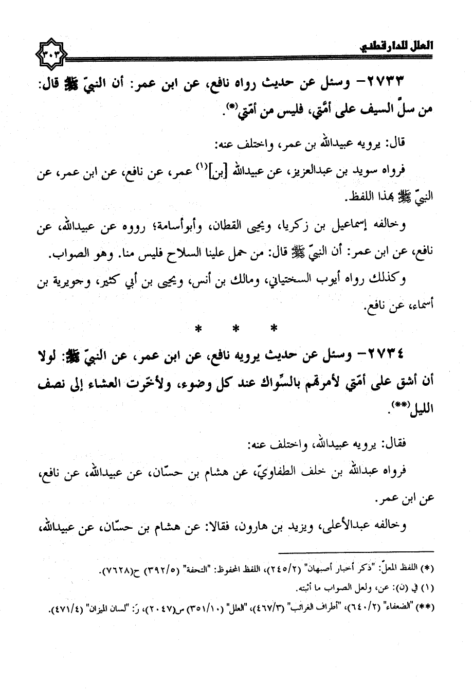 2733- وسئل عن حديث رواه نَافِعٍ، عَنِ ابْنِ عُمَرَ؛ أَنَّ النَّبِيَّ صَلَّى اللَّهُ عليه وسلم قال: من سل السيف على أمتي، فليس من أمتي.