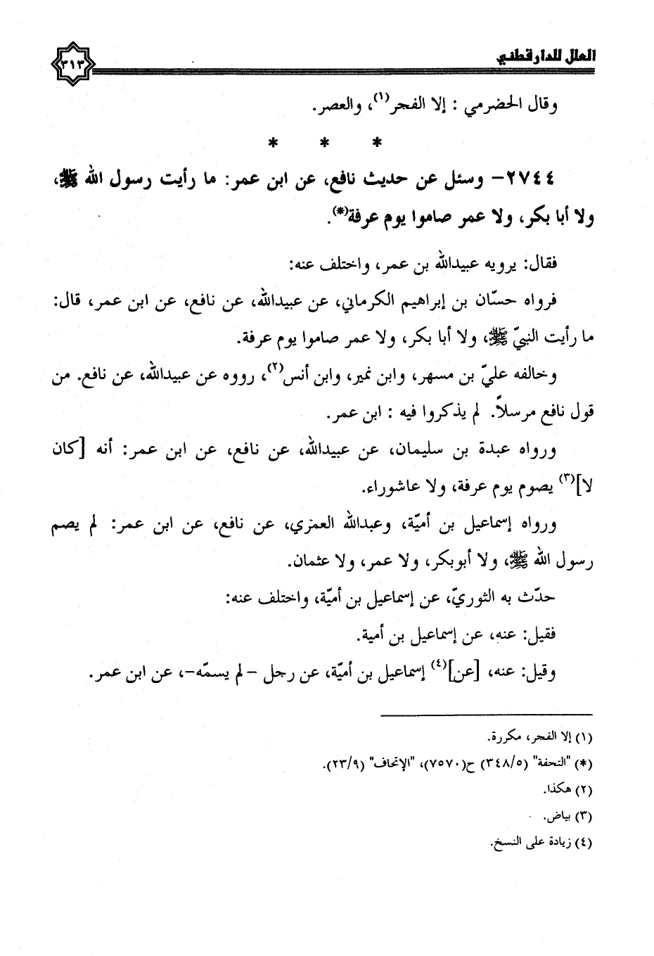 2744- وَسُئِلَ عَنْ حَدِيثِ نَافِعٍ، عَنِ ابْنِ عُمَرَ: ما رَأَيْتُ رَسُولَ اللَّهِ صَلَّى اللَّهُ عَلَيْهِ وَسَلَّمَ، ولا أبا بكر، ولا عمر صاموا يوم عرفة.