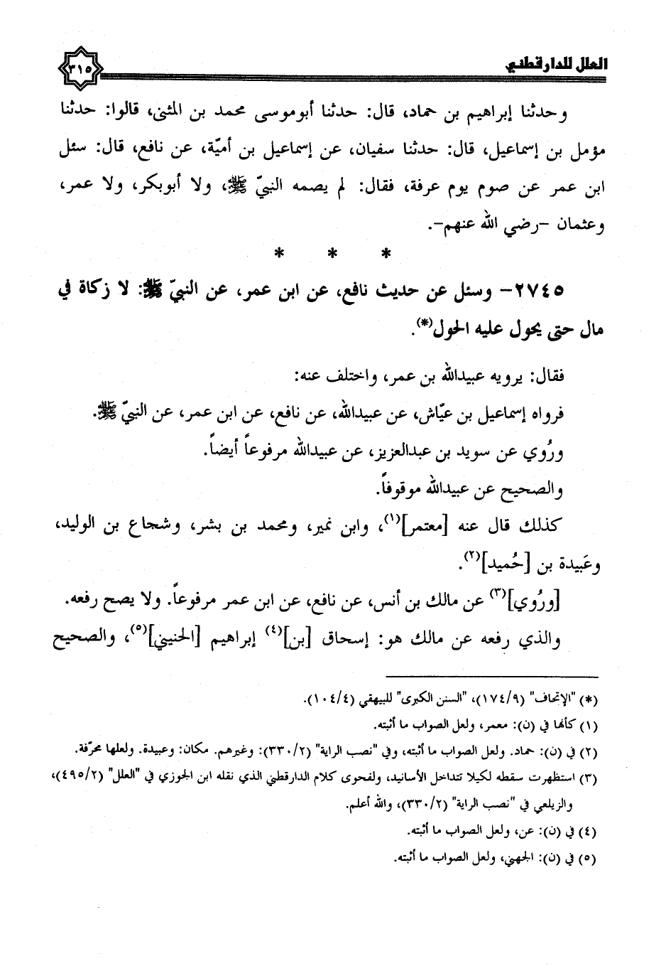2745- وَسُئِلَ عَنْ حَدِيثِ نَافِعٍ، عَنِ ابْنِ عُمَرَ، عَنِ النَّبِيِّ صَلَّى الله عليه وسلم: لا زكاة في مال حتى يحول عليه الحول.