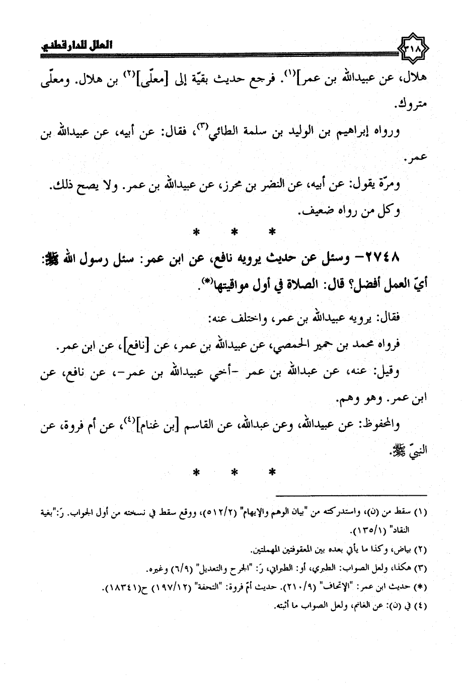 2748- وسئل عن حديث، يرويه نافع، عن ابن عمر: سُئِلَ رَسُولُ اللَّهِ صَلَّى اللَّهُ عَلَيْهِ وَسَلَّمَ: أي العمل أفضل؟ قال: الصلاة في أول مواقيتها.