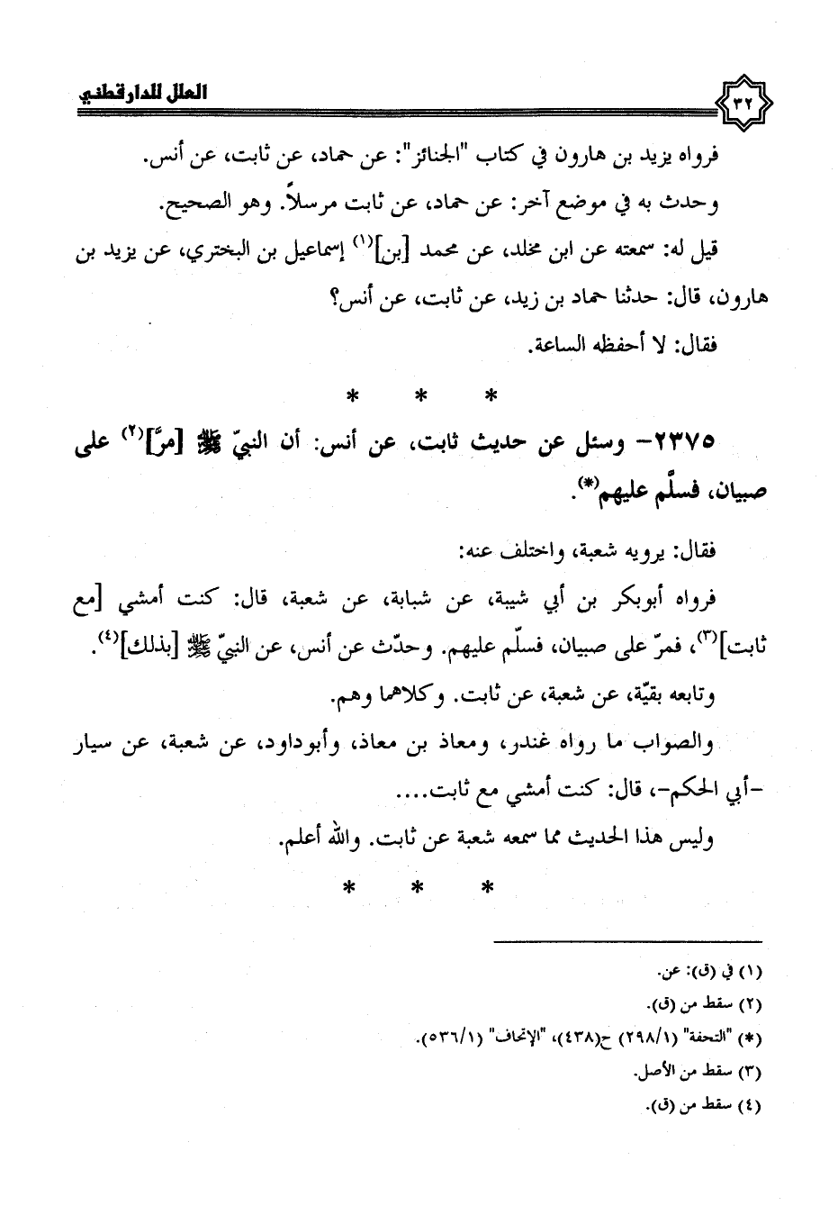 2375- وسئل عن حديث ثابت، عَنْ أَنَسٍ أَنَّ النَّبِيَّ صَلَّى اللَّهُ عَلَيْهِ وسلم مر على صبيان، فسلم عليهم.
