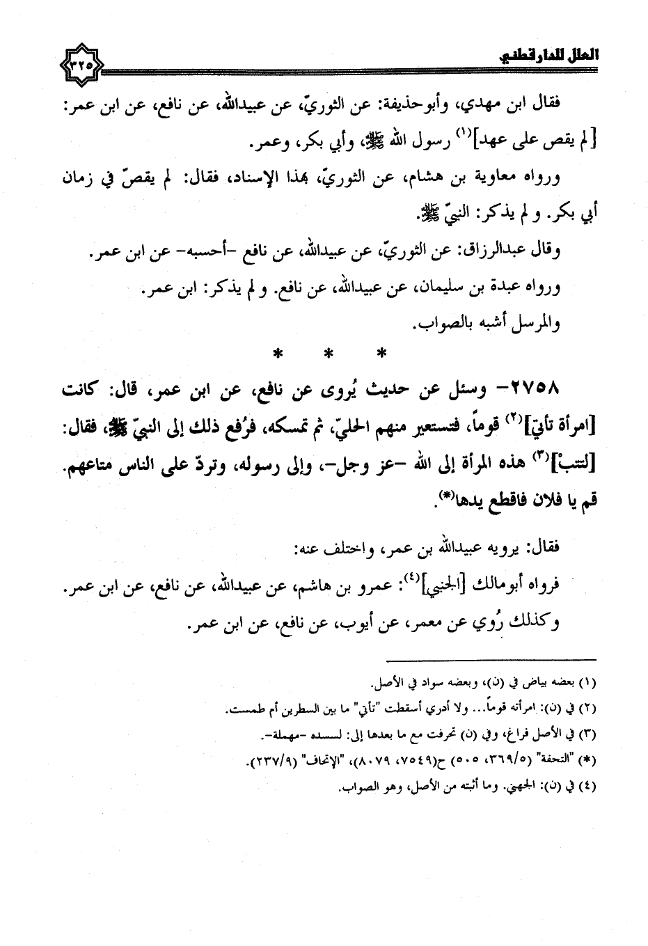 2758- وسئل عن حديث يروى عن نافع، عن ابن عمر، قال: كانت امرأة تأتي قوما فتستعير منهم الحلي، ثم تمسكه، فرفع ذلك إِلَى النَّبِيِّ صَلَّى اللَّهُ عَلَيْهِ وَسَلَّمَ، فَقَالَ: لتتب هذه المرأة إلى الله عز وجل وإلى رسوله، وترد على الناس متاعهم، قم يا فلان فاقطع يدها.