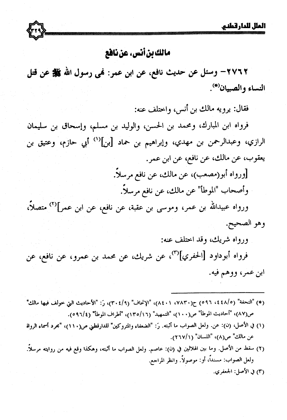 2762- وَسُئِلَ عَنْ حَدِيثِ نَافِعٍ، عَنِ ابْنِ عُمَرَ، نَهَى رَسُولُ اللَّهِ صَلَّى اللَّهُ عَلَيْهِ وَسَلَّمَ، عن قتل النساء والصبيان.