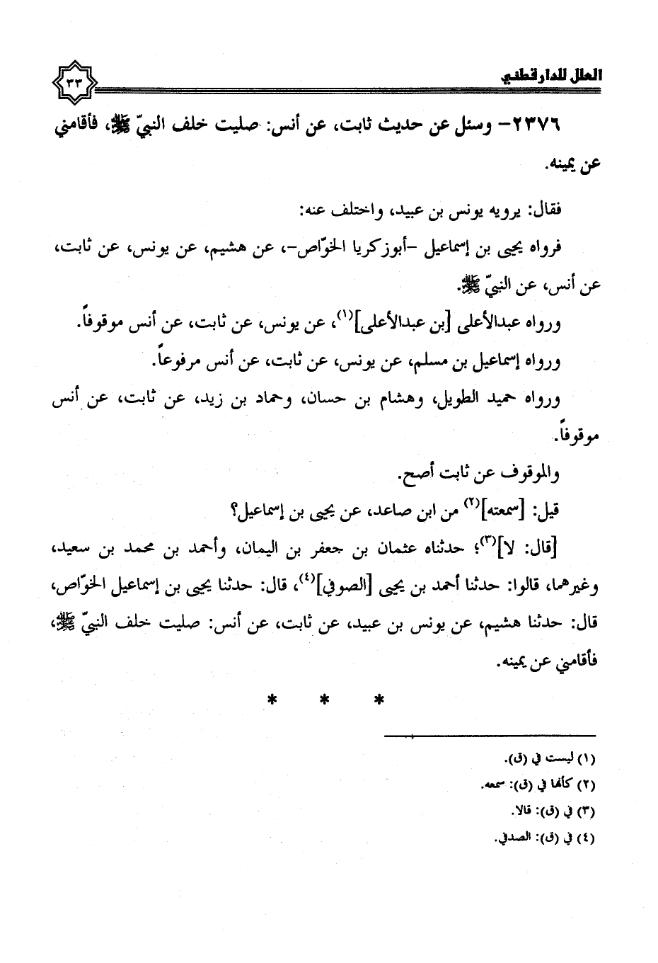 2376- وسئل عن حديث ثابت، عن أنس صليت خلف النبي صلى الله عليه وسلم، فأقامني عن يمينه.