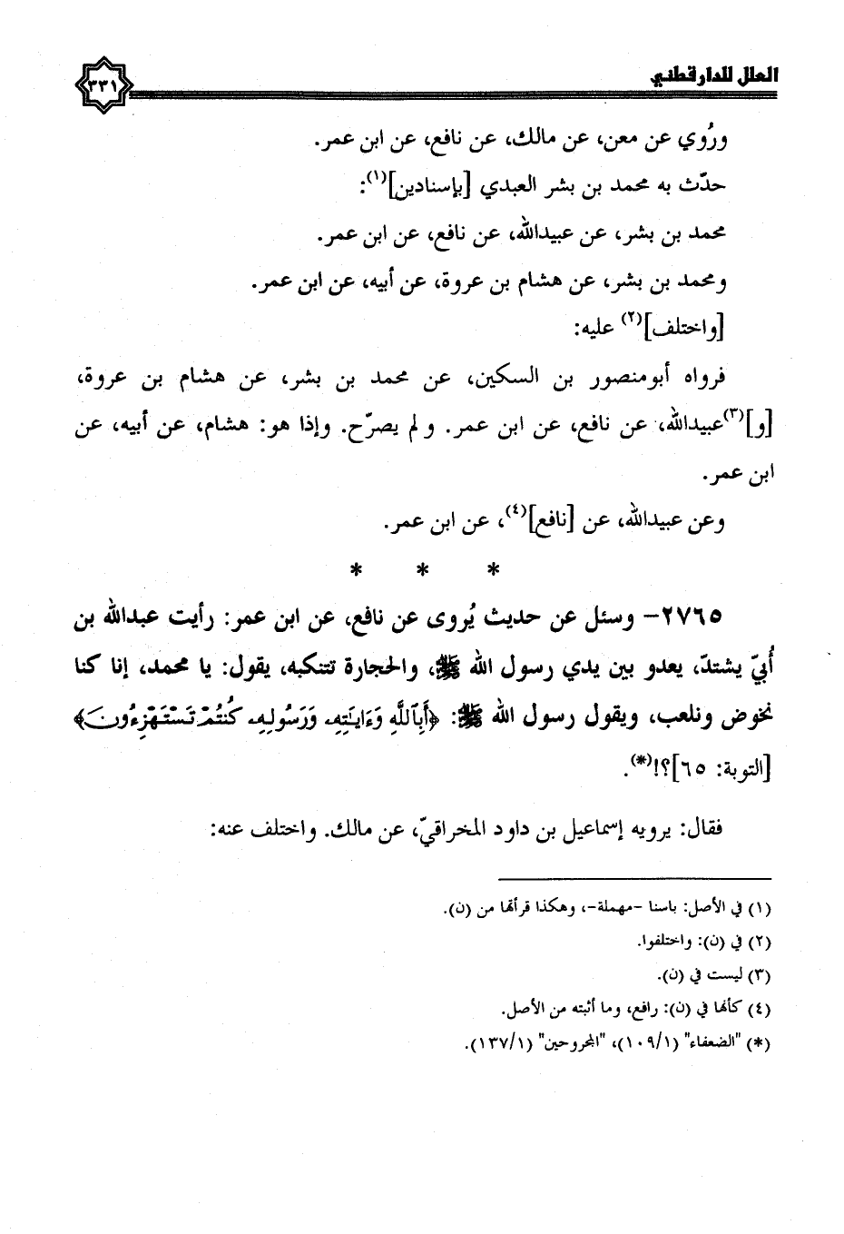 2765- وسئل عن حديث يروى عن نافع، عن ابن عمر: رأيت عبد الله بن أبي يشتد، يعدو بين يدي رسول الله صلى الله عليه وسلم والحجارة تتنكبه، يقول: يا محمد إنا كنا نخوض ونلعب، ويقول رسول الله صلى الله عليه وسلم: {أبالله وآياته ورسوله كنتم تستهزؤون} .
