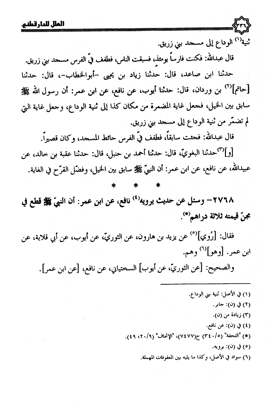 حدثنا ابن صاعد، قال: حدثنا زياد بن يحيى أبو الخطاب، قال: حدثنا حاتم بن وردان، قال: حدثنا أيوب، عن نافع، عن ابن عمر، أن رسول الله صلى الله عليه وسلم سابق بين الخيل فجعل غاية المضمرة من مكان كذا إلى ثنية الوداع وجعل غاية التي لم تضمر من ثنية الوداع إلى مسجد بني زريق قال عبد الله: فجئت سابقا، فطفف بي (1) الفرس حائط المسجد، وكان قصيرا.