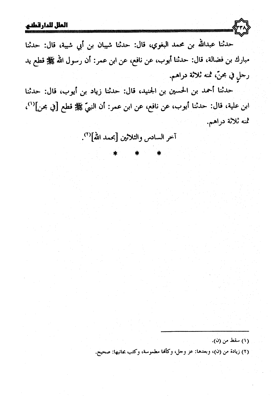 حدثنا أحمد بن الحسين بن الجنيد، قال: حدثنا زياد بن أيوب، قال: حدثنا ابن علية، قال: حدثنا أيوب، عن نافع، عَنِ ابْنِ عُمَرَ، أَنَّ النَّبِيَّ صَلَّى اللَّهُ عَلَيْهِ وَسَلَّمَ قَطَعَ فِي مجن ثمنه ثلاثة دراهم.