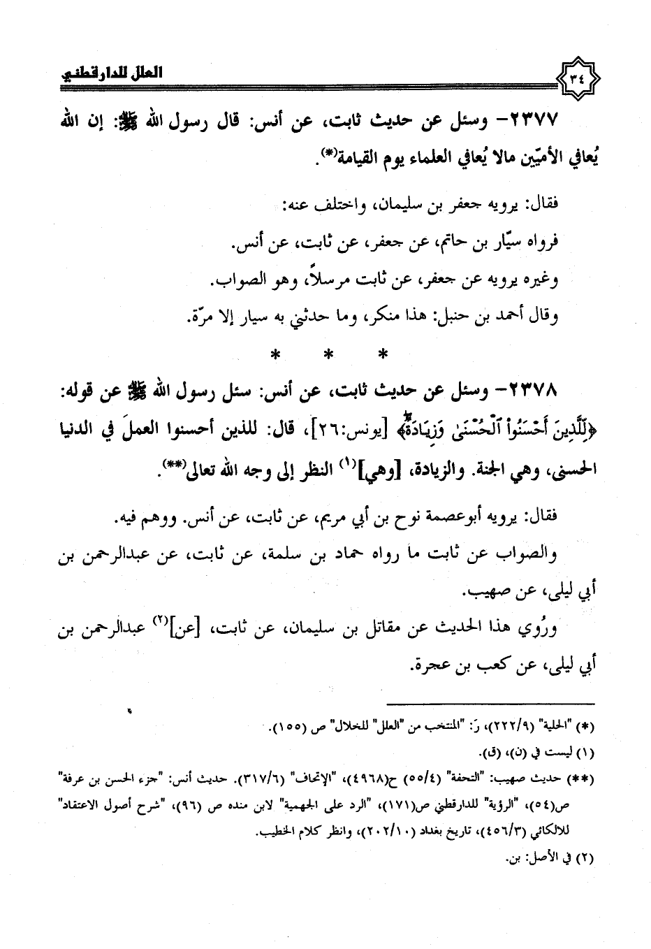 2378- وسئل عن حديث ثابت، عن أنس سُئِلَ رَسُولُ اللَّهِ صَلَّى اللَّهُ عَلَيْهِ وَسَلَّمَ عن قوله: {للذين أحسنوا الحسنى وزيادة} قال: للذين أحسنوا العمل في الدنيا الحسنى، وهي الجنة، والزيادة، وهي النظر إلى وجه الله تعالى.