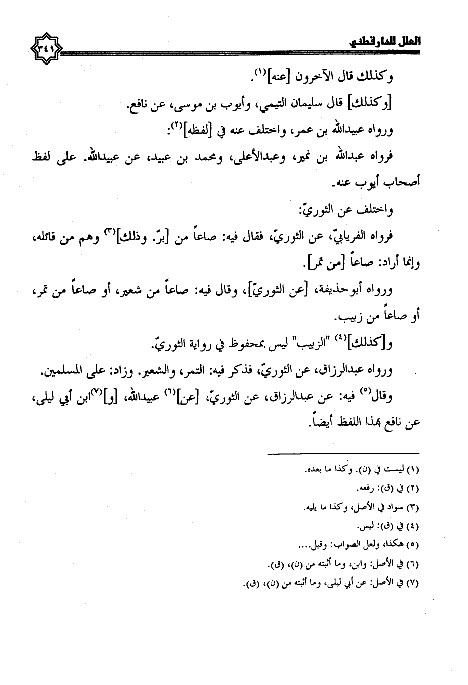ورواه عبد الرزاق، عن الثوري، فذكر فيه التمر والشعير وزاد على المسلمين، وقال فيه: عن عبد الرزاق، عن الثوري، عن عبيد الله، وابن أبي ليلى، عن نافع بهذا اللفظ أيضا.