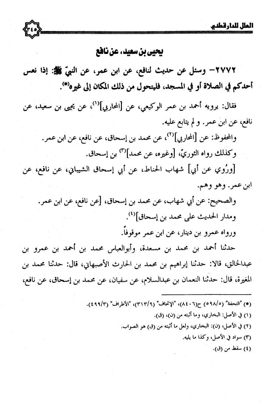 2772- وسئل عن حديث لنافع، عَنِ ابْنِ عُمَرَ، عَنِ النَّبِيِّ صَلَّى اللَّهُ عليه وسلم: إذا نعس أحدكم في الصلاة، أو في المسجد فليتحول من ذلك المكان إلى غيره.
